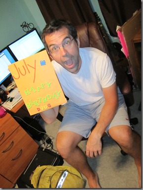 July was all about Doug (as it is his birthday month)! They chose to write it on orange construction paper (as it is DB’s favorite color) and require a meal at Felipe’s, snowballs and exercise. What a fabulous “doug” date!